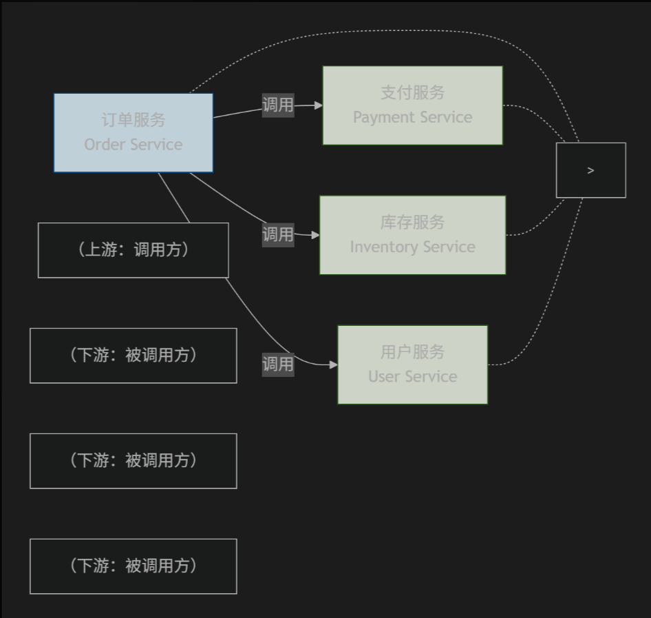 从图中可以看出,订单服务是支付服务、库存服务和用户服务的上游(调用方),而这些被调用的服务则是下游(被调用方)。